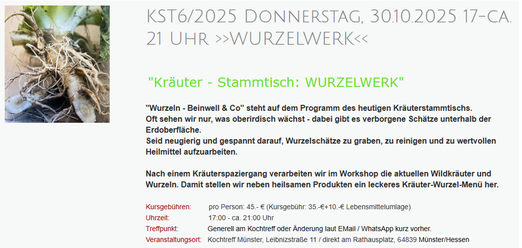 Der Kräuter - Stammtisch - Termin mit dem Thema "WURZELWERK" findet statt aber wird vom 30.10.auf den 20.11.2025 verschoben.